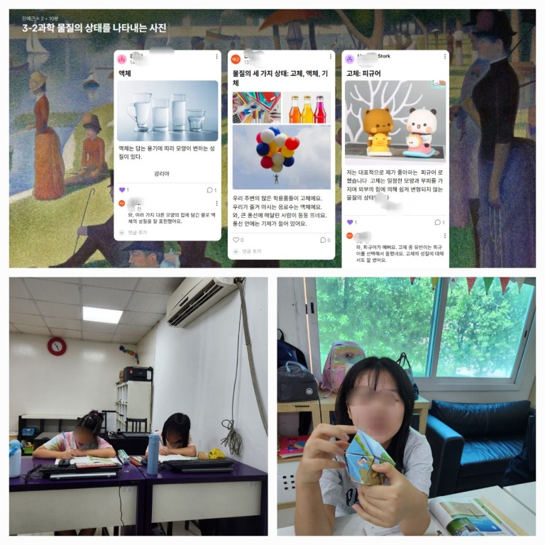 3학년은 공유 플랫폼에 각자 찾은 고체, 액체, 기체에 대해 올렸어요. 6학년은 2단원 계절의 변화에 들어가면서 사계절의 모습이 담긴 입체 도형을 만들어 보았어요. |