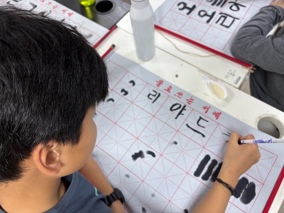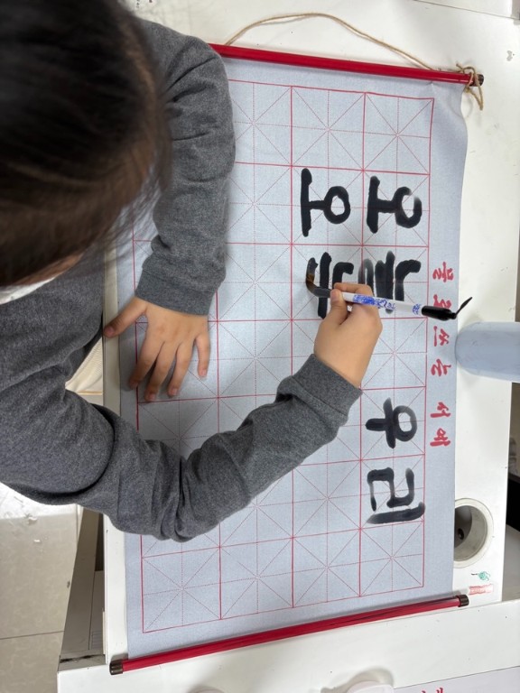 미술시간에 서예의 기본과 판본체 궁체를 알아보고 연습하는 모습입니다