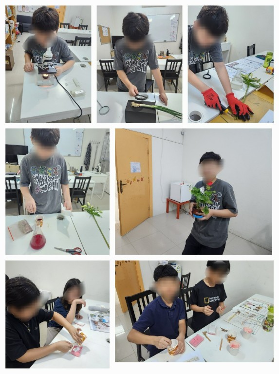 6학년은 오늘 현미경으로 세포를 관찰하고, 뿌리와 줄기, 잎의 역할을 알아보기 위해 파뿌리, 백합줄기, 제라늄 잎으로 실험을 했어요. 뿌리를 자른 파와 자르지 않은 차를 물에 넣어 3일 후 물의 줄어든 양을 알아보기 위한 실험, 백합줄기를 붉은색 식용색소에 넣어서 하루 지나 줄기를 관찰하려는 실험, 제라늄 잎을 알루미늄 포일로 싸고, 잎의 뒷면에 푸른색 염화 코발트지를 붙여서 하루가 지났을 때 어떻게 되는지 보기 위한 실험이에요. 5학년은 화석 모형 만들기를 했어요. 각자 작은 플라스틱 공룡이나 해마 등을 골라 화석 모형을 만들어 보았어요. 정확하게 전자 저울을 사용하여 알지네이트와 석고 가루의 무게를 재고 물의 양을 정확하게 조절해서 틀에 부었어요. 마르는 시간을 기다리고 있는데 예쁜 공룡 화석이 만들어질 것 같아요. |