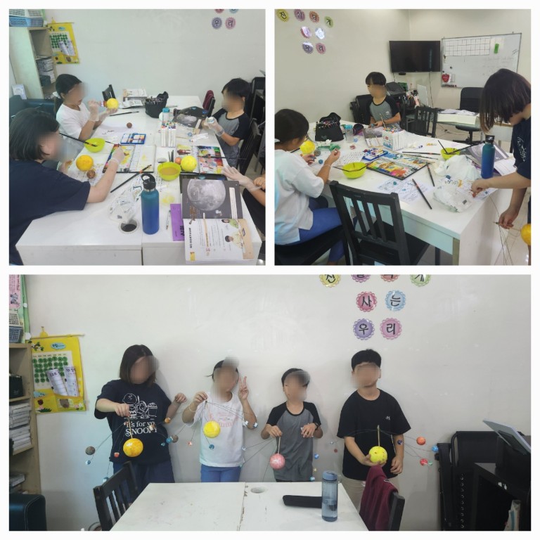 태양계에 대해 공부하면서 태양계 모형을 만들어 보았어요. 태양계의 중심 태양과 지구를 포함한 8개의 행성에 대해 지난주 미리 조사하였고 이번주에는 직접 만들어 보는 시간을 가졌습니다. |