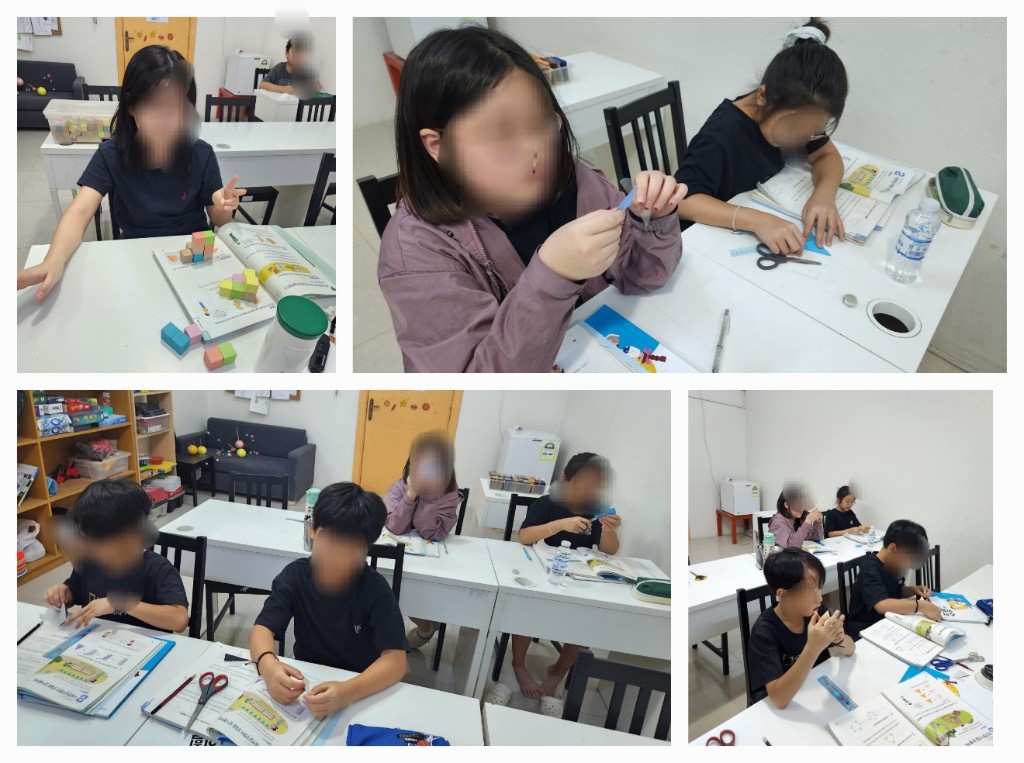 6학년은 쌓기나무를 쌓으면서 위, 앞, 옆에서 본 모양에 대해 생각하며 공간과 입체에 관해 배우고 있어요. 4학년은 이등변삼각형과 직각삼각형을 배우고 있어요. 색종이를 접어 이등변삼각형을 만들어 보고 정삼각형은 세 각을 중심으로 반으로 접으면서 세 각이 모두 크기가 같다는 것을 배웠어요. |