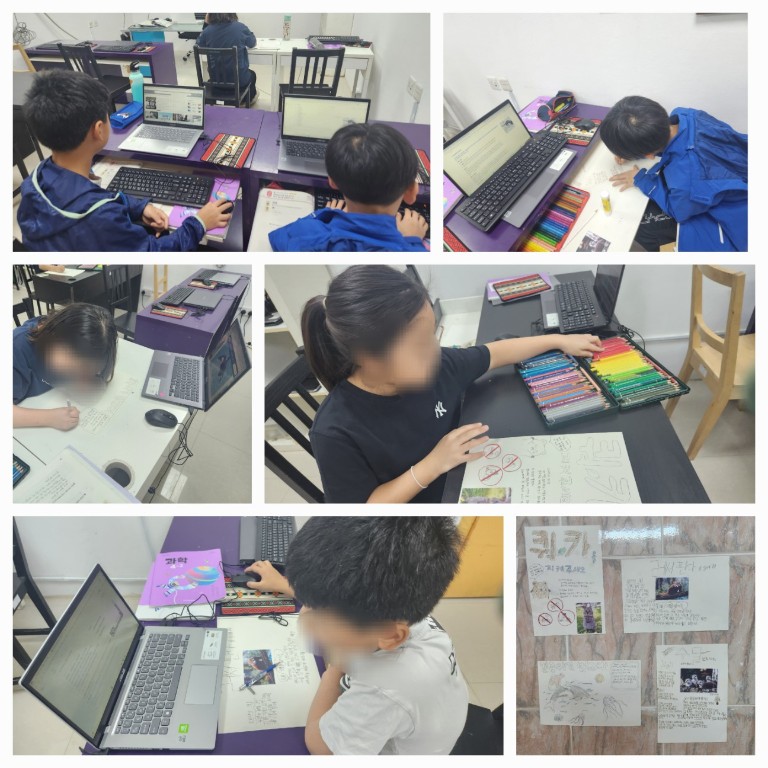 멸종 위기의 동물에 대해 찾아보고 이 동물들이 왜 멸종 위기에 놓이게 되었는지 알게 되었어요. 그래서 우리가 이 멸종 위기의 동물을 지켜주기 위한 실천 방안을 생각해 보았어요. 멸종 위기의 동물을 보호하는 캠페인 활동을 하기로 하고 위의 내용들로 포스터를 만들어 학교에 1주일동안 게시하기로 했어요. 우리의 포스터의 주인공 레서판다, 수달, 범고래, 쿼카를 지켜주세요! |
