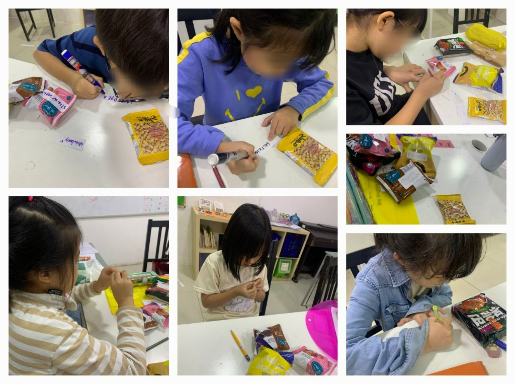1,2,3학년 친구들은 간식과 한국 라면에 이름표 붙이기를 하면서 어휘를 확장하고 철자 실력도 키우는 시간을 가졌어요. |
