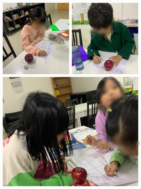 학생들은 사실과 의견을 구분하는 방법을 배우고 있어요. 먼저 사실을 진술하는 것에 대해 배웠고, 그 다음에는 의견을 말하는 방법과 의견을 나타내는 단서를 주는 단어들을 배웠어요. 마지막으로 사과에 대해 사실과 의견을 직접 써 보는 활동을 했어요.