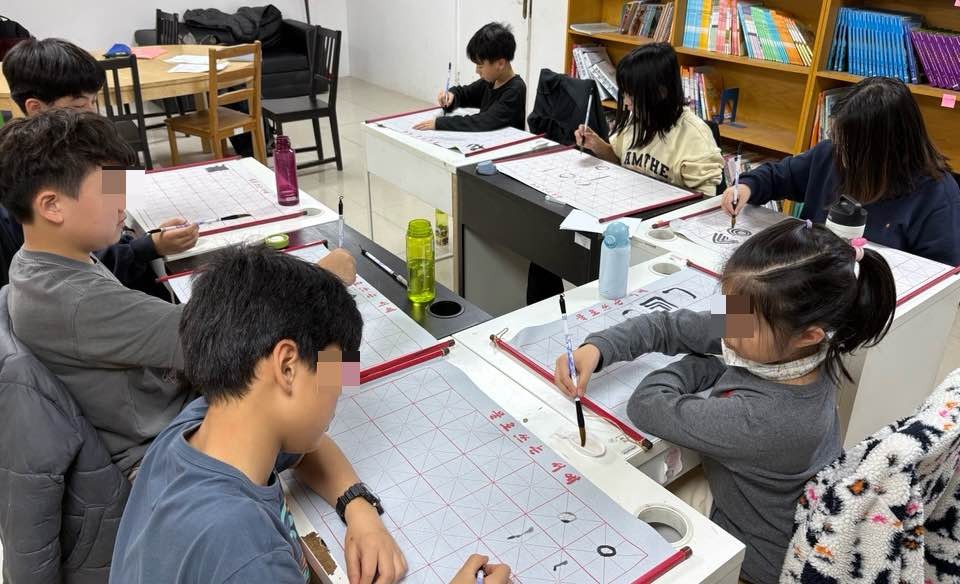 미술시간에 서예의 기본과 판본체 궁체를 알아보고 연습하는 모습입니다