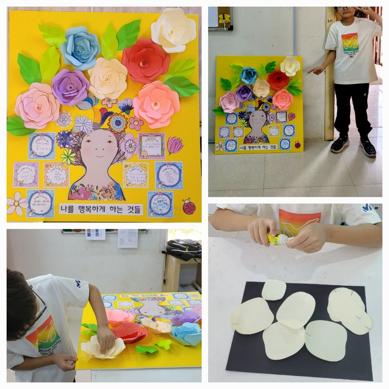 리야드에도 봄이 왔어요. 한국의 꽃소식을 기다리며 봄맞이 활동을 했습니다. 나를 행복하게 하는 것들을 꽃종이에 적고, 정성껏 꽃 한 송이를 피워내어 우리들만의 꽃밭을 완성했습니다.